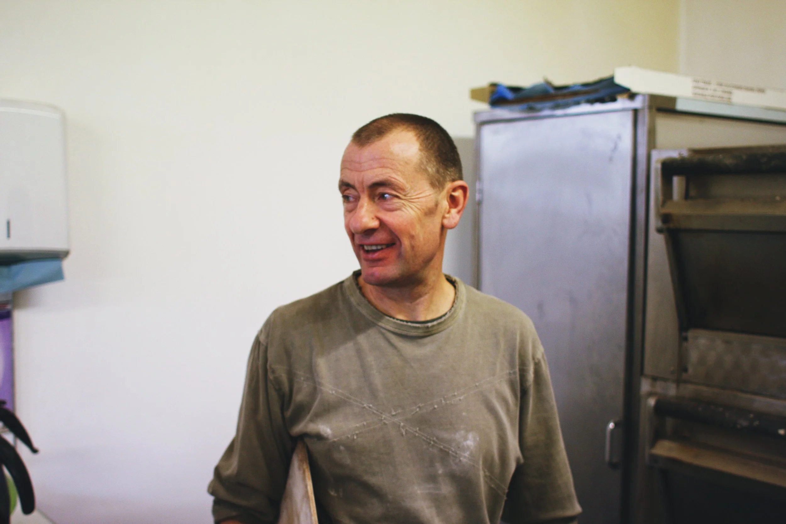 Fiona, Jock's partner, came into the room with a big bin filled dough and Jock attacked the bubbling pale mound with gusto, scraping it quickly out of the plastic bin onto the metal work table. He gestured at me to come over and showed me how to shape the balls of dough into loaves, and patiently repeated himself when I failed to understand his thick Scottish brogue (which was most of the time). Over the next couple of hours, they taught me how to handle the different doughs and how to shape rolls, loaves, baguettes, scones. I learned how to tell the difference between the malted wheat dough and the wholegrain dough, how to correctly take care of a sourdough starter, how to spray jets of water into the back of the ovens to create a cloud of steam.